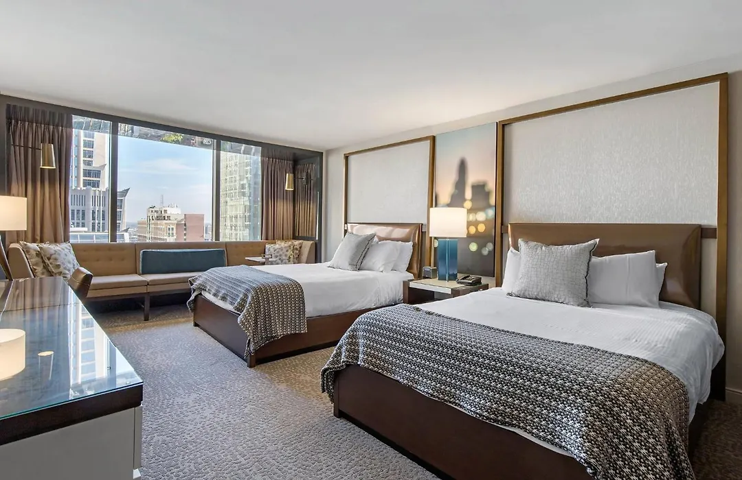 Omni Charlotte Hotel features 373 guest rooms with plush bedding, floor-to-ceiling windows, and options for king or queen beds. Special amenities include a mini-fridge, Keurig coffee machine, and complimentary WiFi.